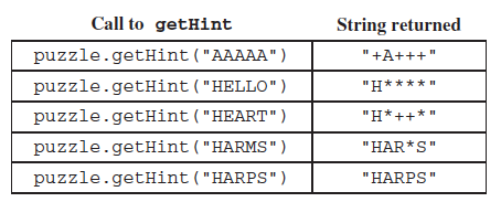 The HiddenWord class will be used to represent the hidden word in the game. The hidden word is passed to the constructor. The class contains a method, getHint that takes a guess and produces a hint.