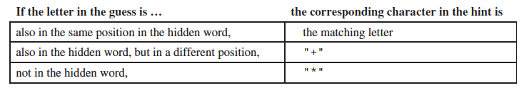 After a guess is made, the player is given a hint that is based on a comparison between the hidden word and the guess. Each position in the hint contains a character that corresponds to the letter in the same position in the guess. The following rules determine the characters that appear in the hint.