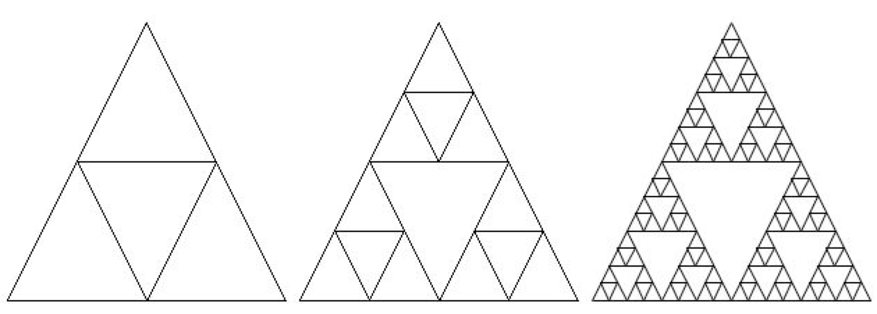 Recursion can also be used to create fractals. A simple example is Sierpinski’s triangle in which you subdivide a triangle into 4 new triangles as shown below. You can then do the some procedure with each new triangle except the center one.