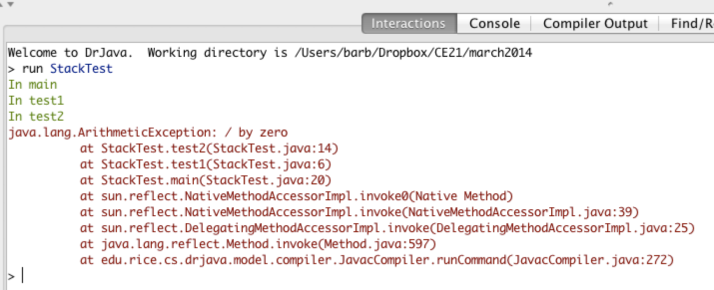 The code above will cause a run-time error of division by zero when it runs. The main method calls the method test1 (at line 20) which calls the method test2 (at line 6) which has the divide by zero error (line 14). This can be seen in the call stack shown below which shows the call stack from the top (most recent method) to the bottom (first method call).