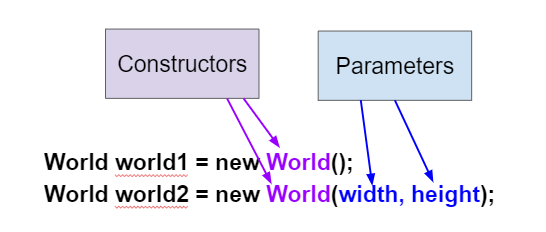 The World class actually has 2 constructors. One doesn’t take any parameters and one takes the world’s width and height.