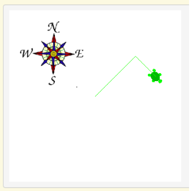 The following program uses a turtle to draw the picture shown to the left, but the lines are mixed up. The program should do all necessary set-up: import items, start the class definition, start the main method, and create a world and turtle. Then it should ask the turtle to turn 45 degrees, go forward 100 pixels, turn right, and then go forward 50 pixels. Next, it should ask the world to show itself. Finally, it should close the main method and class definition. We have added a compass to the picture to indicate the directions north, south, west, and east. Drag the needed blocks of statements from the left column to the right column and put them in the right order. There are three extra blocks that are not needed in a correct solution. Then click on Check Me to see if you are right. You will be told if any of the lines are in the wrong order or are the wrong blocks.