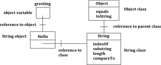 Figure 2: Object variable of type String with a reference to a String object which has a reference to the String class which has a reference to the Object class.¶