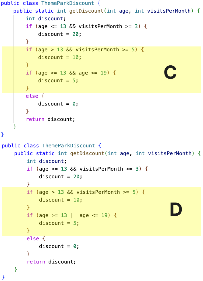 A theme park offers discounts on ticket prices based on age and the number of visits per month. The parameter age is the person's age in years, and visitsPerMonth is the average number of visits per month. The result is the discount percentage encoded as an int. The conditions are: