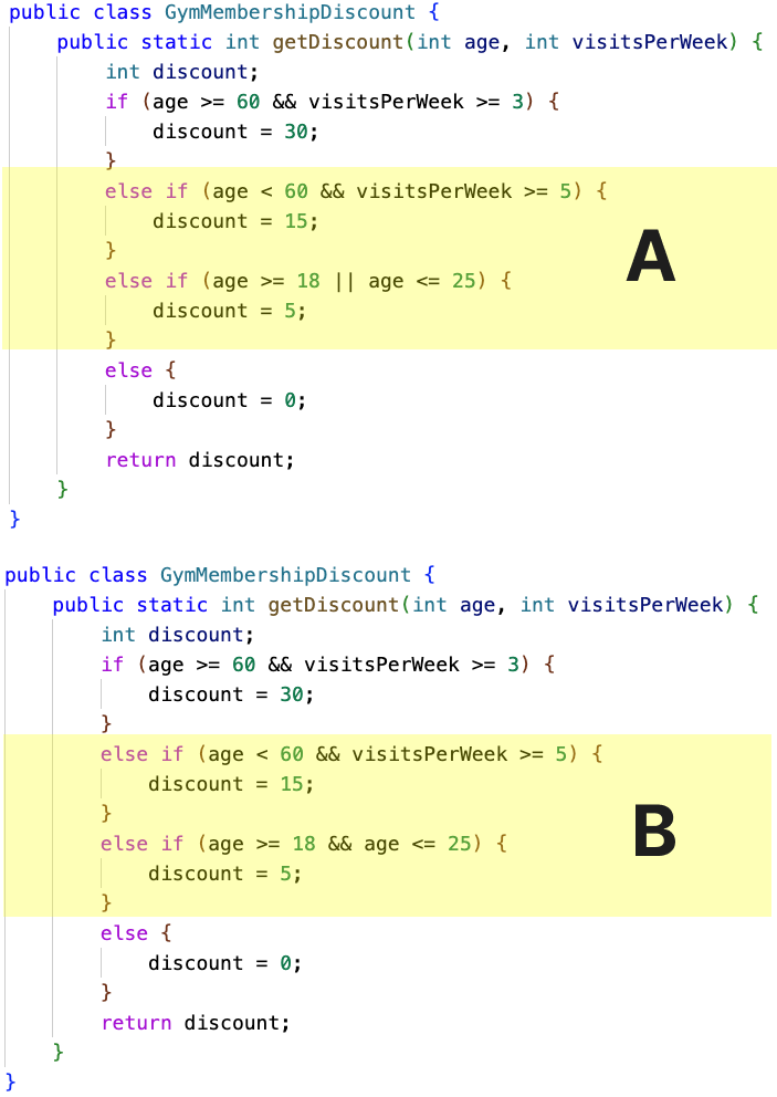 - If the person is 60 years old or older and visits the gym 3 times or more per week, they get a 30% discount.