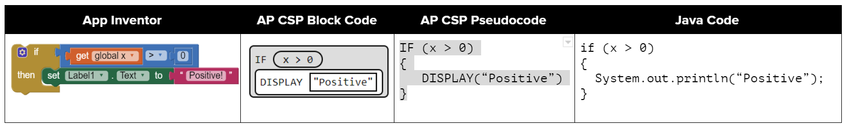 Figure 1: Comparison of App Inventor if block, AP CSP ifs, and Java if statements¶
