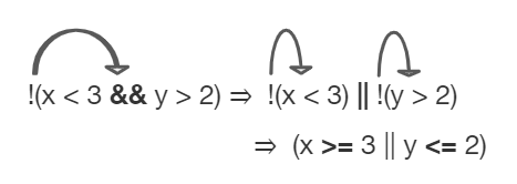 Often, you can simplify boolean expressions to create equivalent expressions. For example, applying De Morgan’s Laws to !(x < 3 && y > 2) yields !(x < 3) || !(y > 2) as seen in the figure below. This can then be simplified further by flipping the relational operators to remove the not. So, !(x < 3) || !(y > 2) is simplified to (x >= 3 || y <= 2) where the relational operators are flipped and the negation is removed. These two simplification steps are seen below.