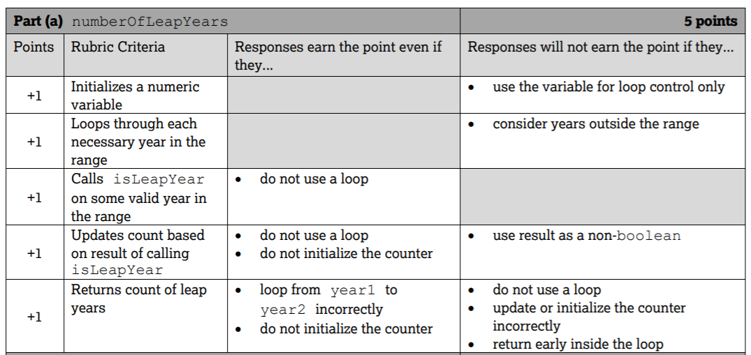 In the 2019 AP exam, part A numberOfLeapYears method was worth 5 points using the rubric below. Did you receive all 5 points? In class, your teacher may have you grade each others’ code.