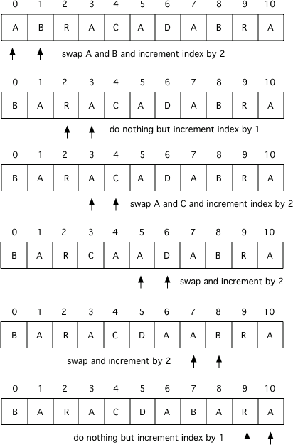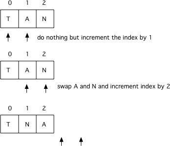 In this case since we didn’t swap any characters we only increment the index by 1 each time through the loop.