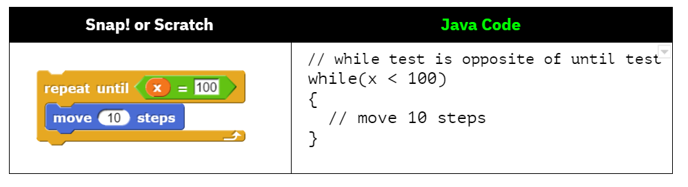 Figure 2: Comparing Snap! or Scratch Repeat Until Loop to Java while loop¶