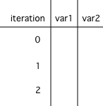 Figure 5: A trace table showing the values of all of the variables each time through the loop. Iteration 0 means before the loop.¶