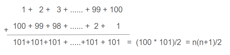 Figure 2: How Gauss quickly calculated the sum of the first 100 natural numbers.¶