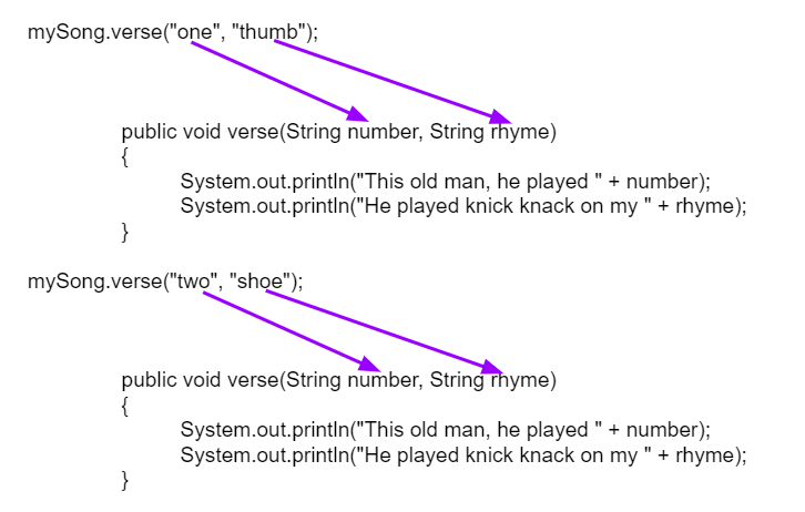 For example, here is a chorus() method definition that we could write for the “This Old Man Song”: