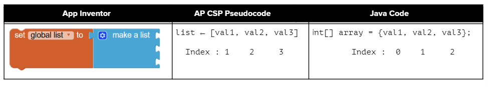 To access the items in an array, we use an indexed array variable which is the array name and the index inside of square bracket [ ]. Remember that an index is a number that indicates the position of an item in a list, starting at 0. Here’s a comparison of App Inventor, AP CSP Pseudocode, and Java array access.