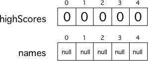 What happens if you try to access an element that is not there? Try to access a highScore or name at index 7 above to see what happens. The index must be between 0 and the length of the array - 1 or it will give an error message called ArrayIndexOutOfBoundsException.