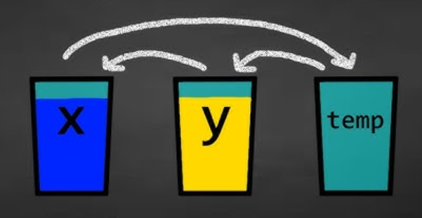 The following programs show how you can reverse an array in place by swapping elements. You can use a while loop or an indexed for loop to do this to swap items from the start and the end of the array. To swap two elements, you need to use a temp variable to store the value of the element you are overwriting. Imagine that you have a glass of milk and a glass of orange juice. How would you swap the contents of the two glasses without making a huge mess? You would need a third glass to hold the contents of one of the glasses while you pour the contents of the other glass into it. Then you can pour the contents of the third glass into the other glass. This is the same idea behind swapping elements in an array.