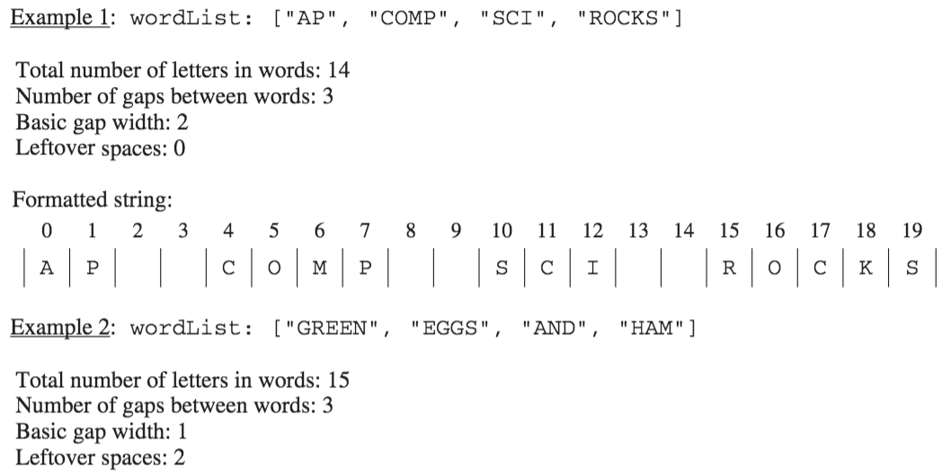 This question involves the process of taking a list of words, called wordList, and producing a formatted string of a specified length.
