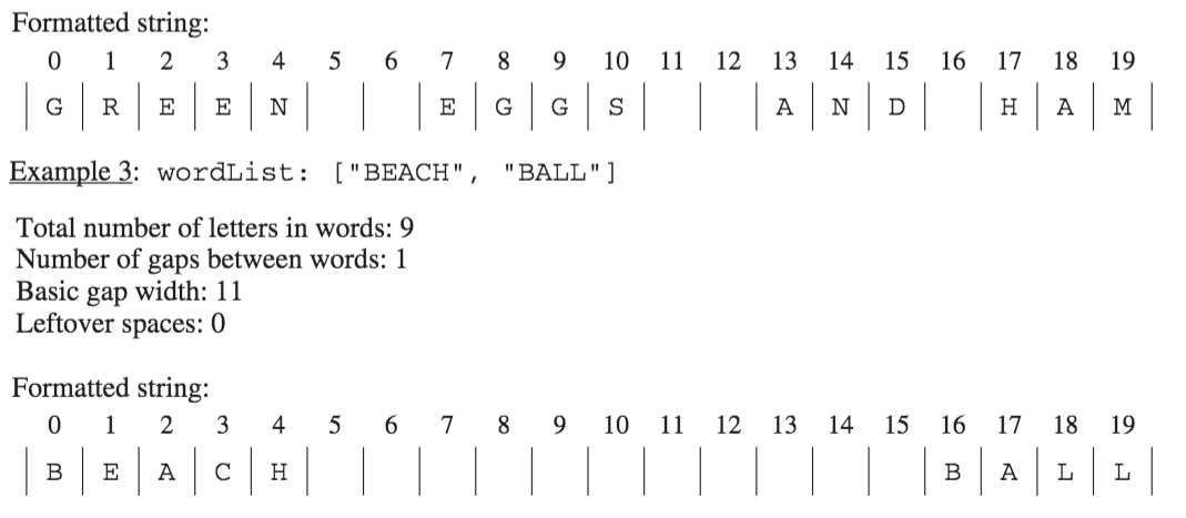 The following three examples illustrate these concepts. In each example, the list of words is to be placed into a formatted string of length 20.