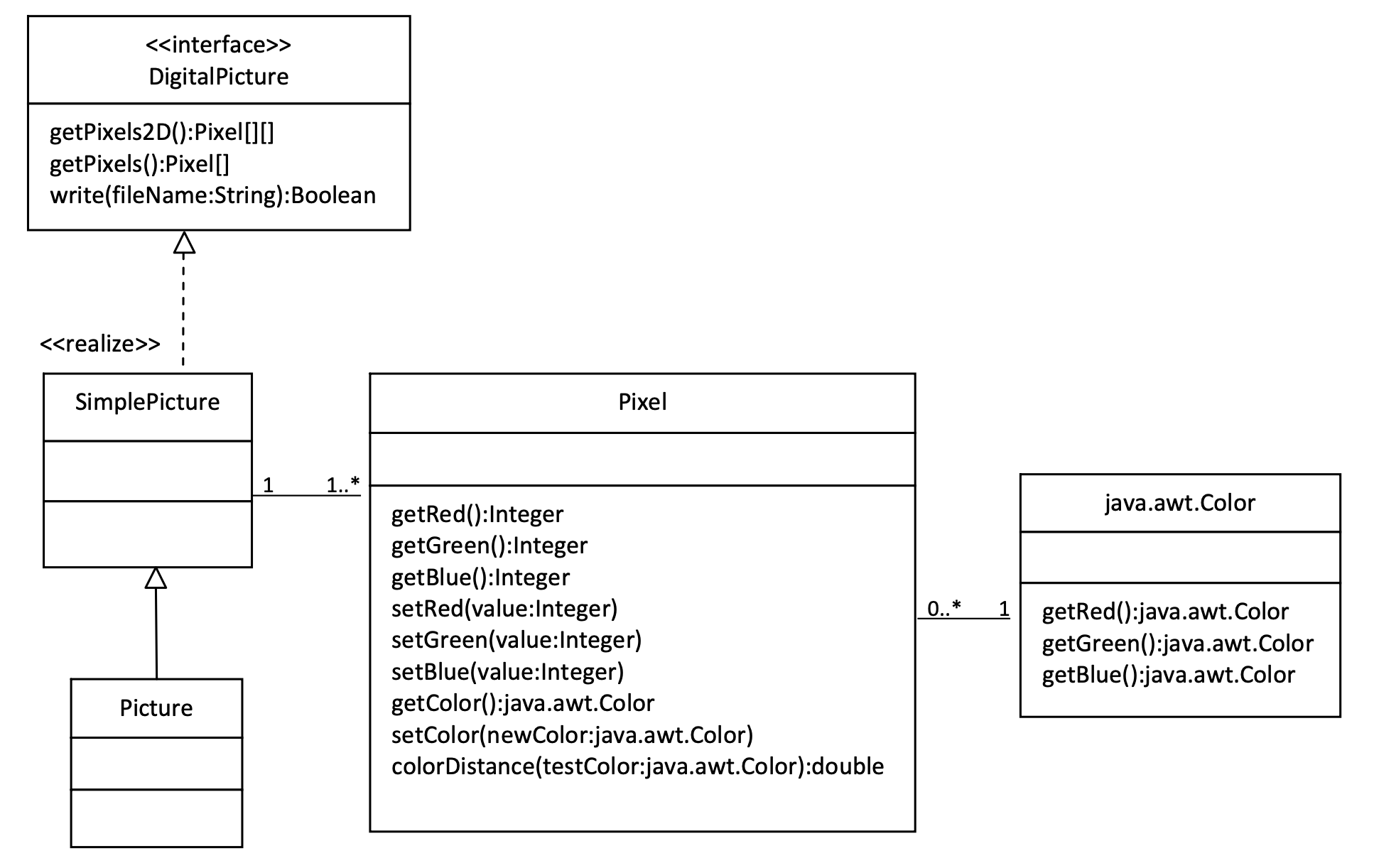 The Picture class inherits attributes and methods from the SimplePicture class and the SimplePicture class implements the DigitalPicture interface as shown in the Unified Modeling Language (UML) class diagram in the figure below.