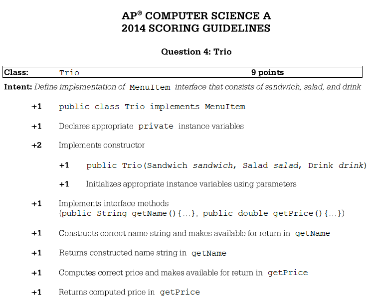 9-9-3-5: Should the student earn 1 point for correctly declaring the methods in the MenuItem interface (getName and getPrice)?
