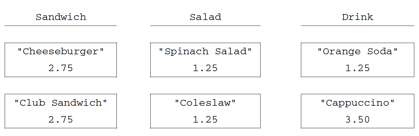 are $2.75 and $1.25). Similarly, a trio consisting of a club sandwich, coleslaw, and a cappuccino would have the