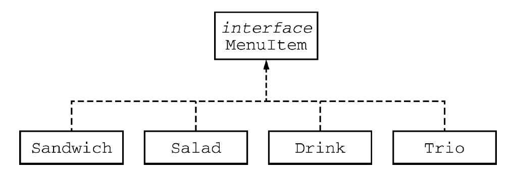 The following diagram shows the relationship between the MenuItem interface and the Sandwich, Salad, Drink, and Trio classes.