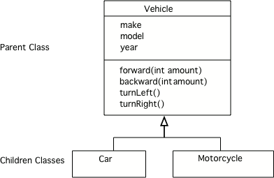 A UML (Unified Modeling Language) class diagram shows classes and the relationships between the classes as seen in Figure 1. An open triangle points to the parent class. The parent class for Car and Motorcycle is Vehicle. The Vehicle class has two child classes or subclasses: Car and Motorcycle.
