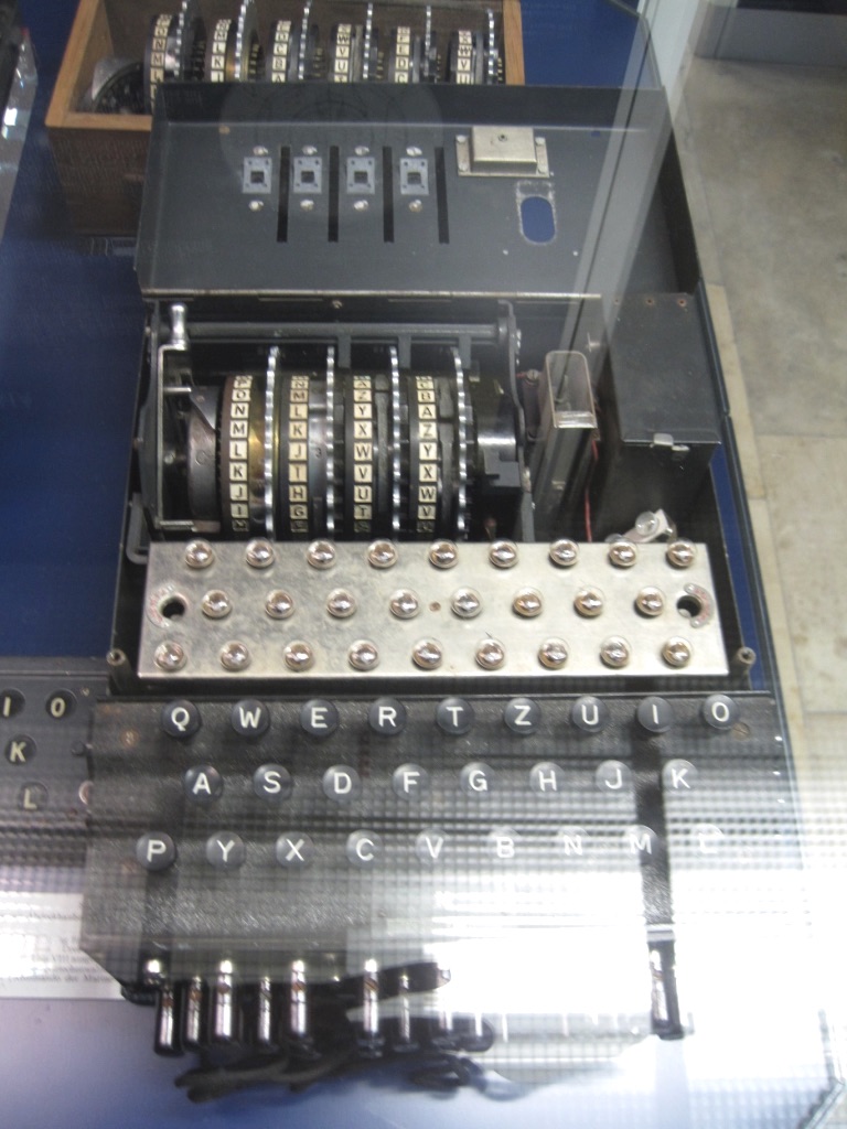Perhaps one of the earliest uses of computers was in the area of encrypting and decrypting secret messages. the image below is a picture I took in the Deutsches Museum in Germany. It is a picture of the german enigma machine. The operator of this machine would type in a message using the keyboard, and the machine would output the encrypted version of the letter. For example you might type the letter p but the machine would output the letter b.
